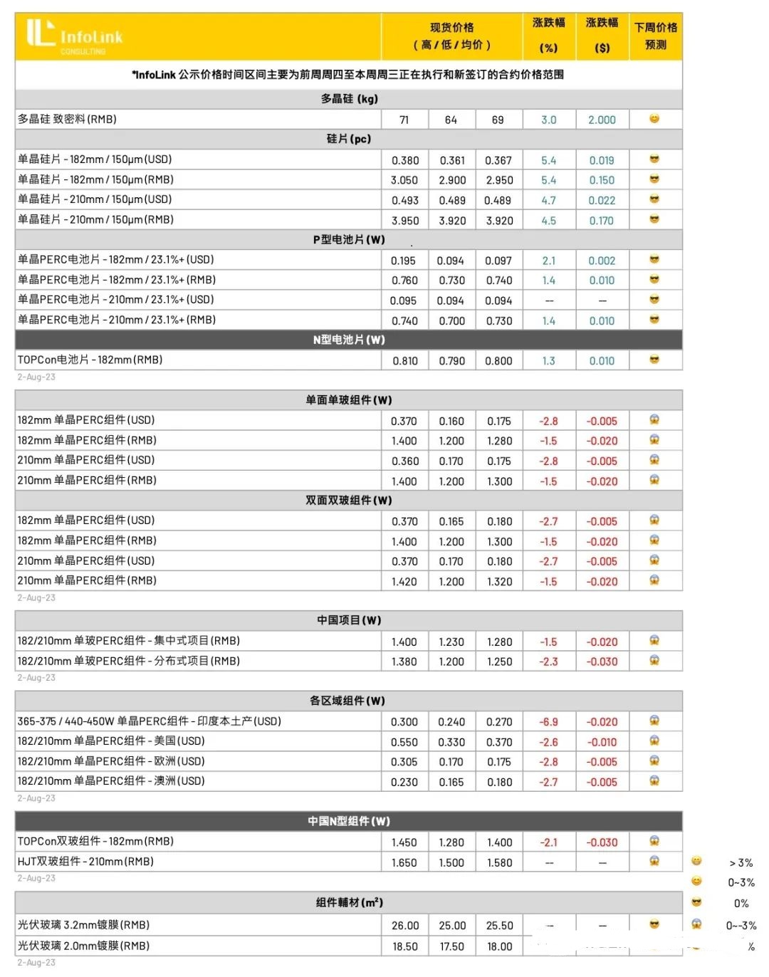 M10PERC电池片价格走势持续与组件价格分化明显,由于电池片处在相对低的买点,组件厂在下半年竞争出货目标下,采购电池片相对积极。然而,尽管当前电池厂家话语权十足,电池厂家们仍要留心维系自己与客户间的良好关系,随着年底TOPCon电池产能砸堆,实质产量释放下,甚至在明年上半年电池环节将会出现严重的供应过剩与价格竞争,届时除了自身的营运决策外,也将需要仰赖客户间的支持配合。