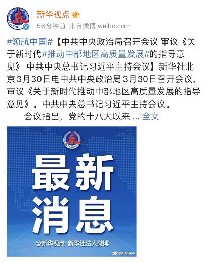中共中央政治局会议审议《关于新时代推动中部地区高质量发展的指导意见》。