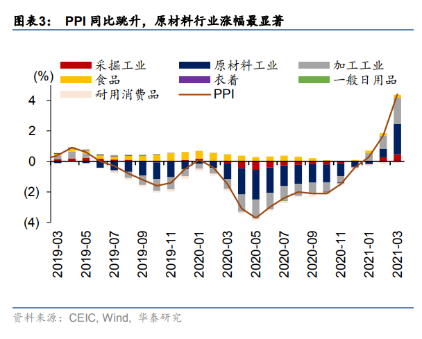 3月PPI同比4.4%,走高2.7个百分点,其中翘尾因素约为1%;PPI环比1.6%,涨幅扩大0.8个百分点。