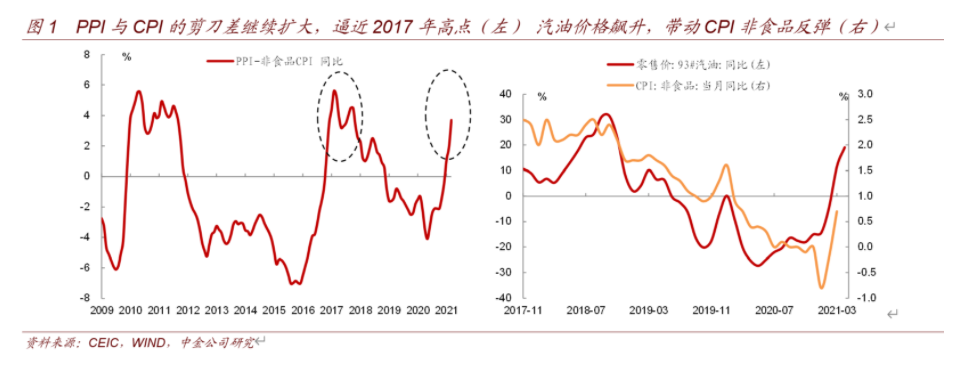 对于PPI走强是否代表供需缺口超预期。中金表示,在国内外疫情仍未消除的背景下,国际、国内供需缺口仍然未修复到疫情前状态,因此会导致国内外的价差。近期全球疫情由于变异病毒有所反复,因此服务消费的恢复和就业的修复还将较慢,拖累油价。国内则已经进入复苏的后段,受供需影响,国内油价高于国外也是正常。其余的预测偏差可能来自中下游部分石化衍生产品的涨价较高。