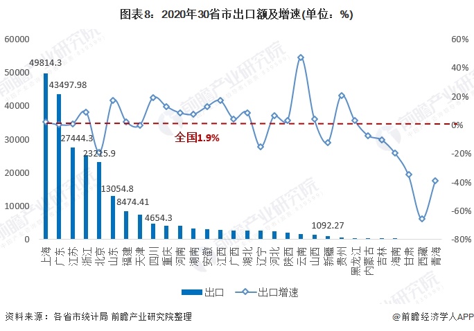 出口为拉动经济发展的三架马车之一。2020年全国外贸出口总额3075.12亿元,同比增长1.9%。从各省市来看,全国出口贸易主要集中在上海、广东、江苏、浙江等沿海经济发达地区,其中上海和广东超过4万亿,江苏、浙江、北京超过2万亿,5个地区外贸出口占全国的53%左右。