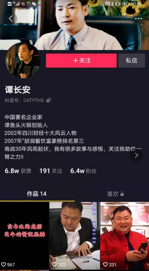 不过,短视频时代下,似乎所有人失败之后都会尝试去做网红。年近60岁的谭长安也不例外。抖音显示,谭长安注册了账号,并发布14个作品。他表示,商战30年风雨起伏,有很多故事和感悟,希望可以助力创业者。
