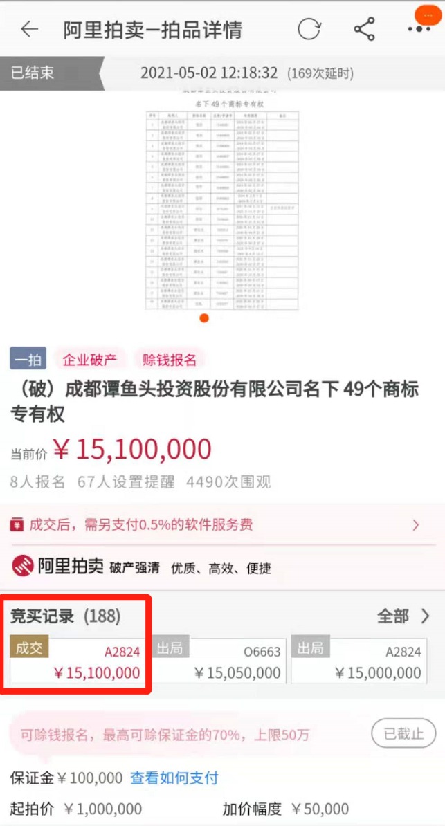 5月2日12点19分,经过188次竞价和169次延时,“谭鱼头”名下49个商标终于以1510万元价格成交。因竞价过于激烈,原本上午10点就该结束的拍卖,169次延时至12时19分方结束。