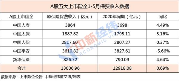 据公告披露,1-5月,中国人寿、中国太保、中国人保、中国平安、新华保险分别实现原保险保费收入3864亿元、1887.82亿元、2817.60亿元、3610.82亿元、826.72亿元,同比增幅分别为4.49%、5.16%、0.37%、-5.66%、4.64%。累计实现原保险保费收入13006.96亿元,同比微增0.69%。