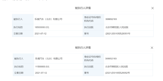 7月12日,乐视汽车(北京)有限公司新增两条被执行人信息,执行法院均为北京市朝阳区人民法院,执行标的总额为3000万元。