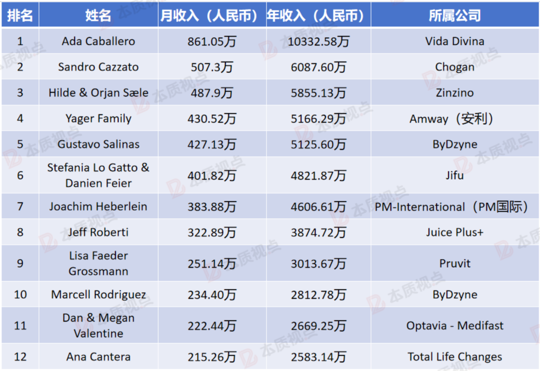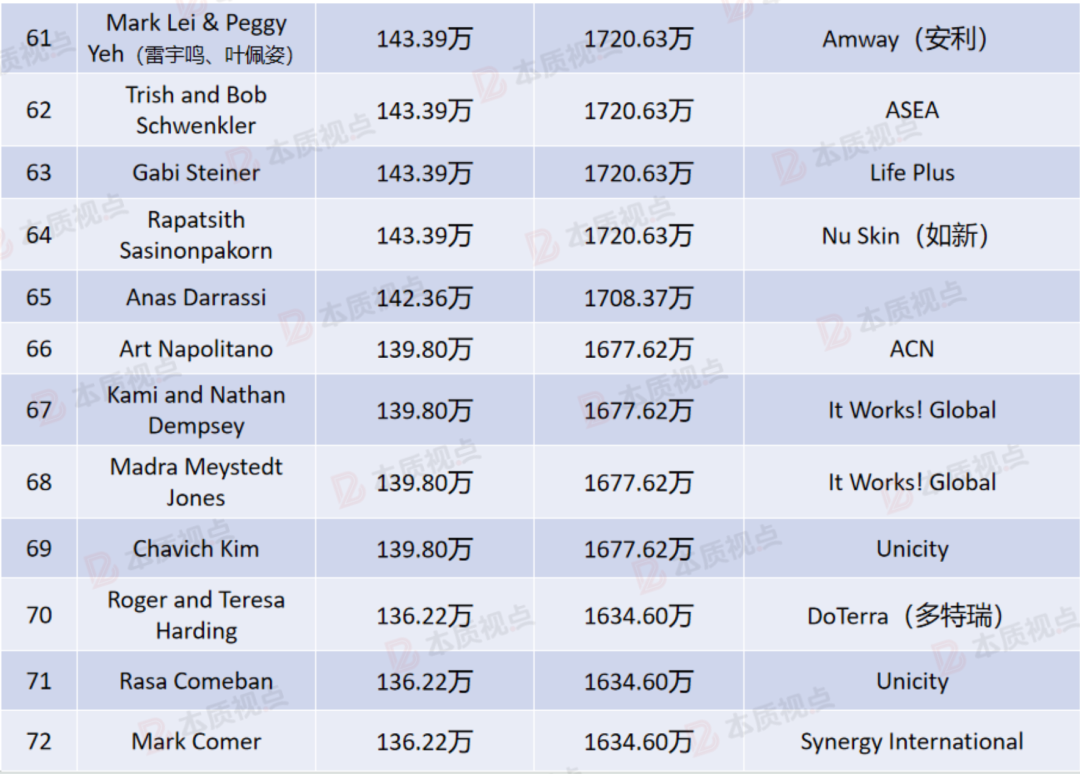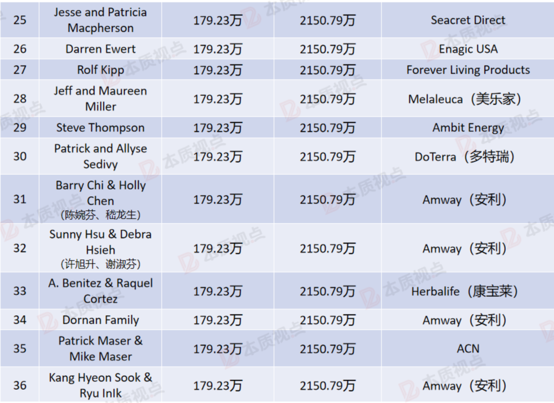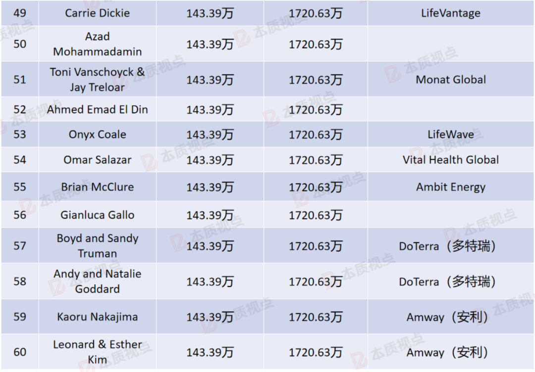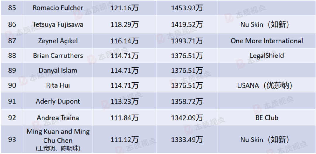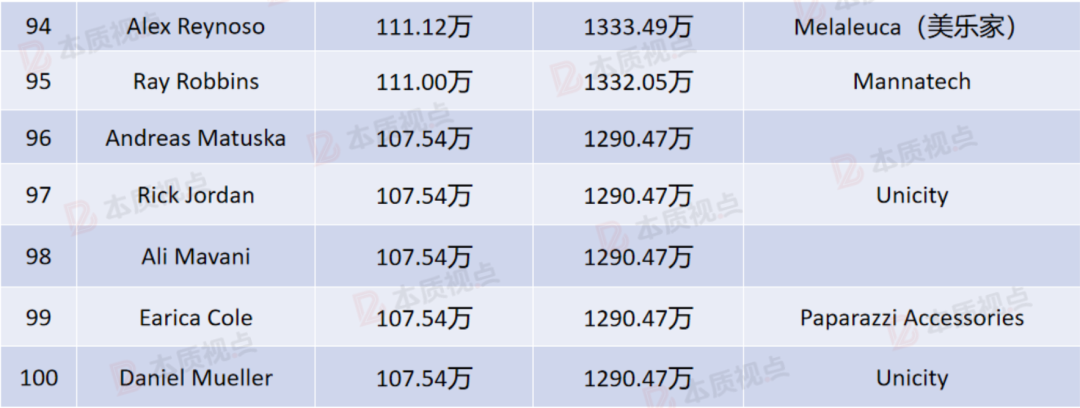 该榜单最后一名是来自立新世纪的Daniel Mueller,他以1290.47万元的年收入排名垫底,这也是所有上榜人员的最低收入。按照这个收入标准,应该有一些中国顶级直销商也能进入该榜单。