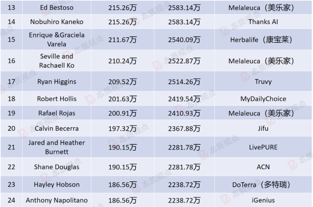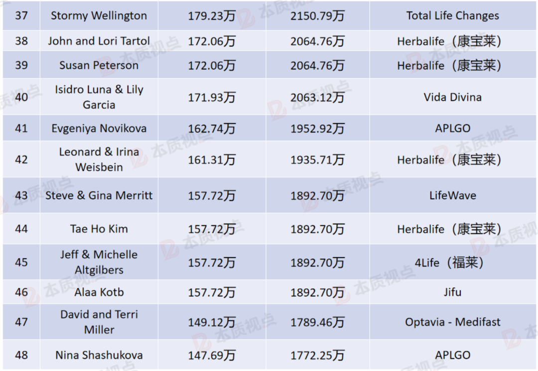 在我们熟悉的企业中,业界老大安利公司收入最高的是耶格家族,以5166.29万元的收入排名第四;近年大火的PM国际经销商Joachim Heberlein不遑多让,以4606.61万元的年收入排名第六;美乐家的Ed Bestoso以2583.14万元的年收入排名第十三,美乐家经销商还同时占据了第十六名和第十九名;康宝莱的Enrique &Graciela Varela以2540.09万元的年收入排名第十五;多特瑞的Hayley Hobson以2238.72万元的年收入排名第二十三;如新的Rapatsith Sasinonpakorn以1720.63万元的年收入排名第四十六;立新世纪的Chavich Kim以1677.62万元的年收入排名第六十九;优莎纳的Rita Hui以1376.51万元的年收入排名第九十。