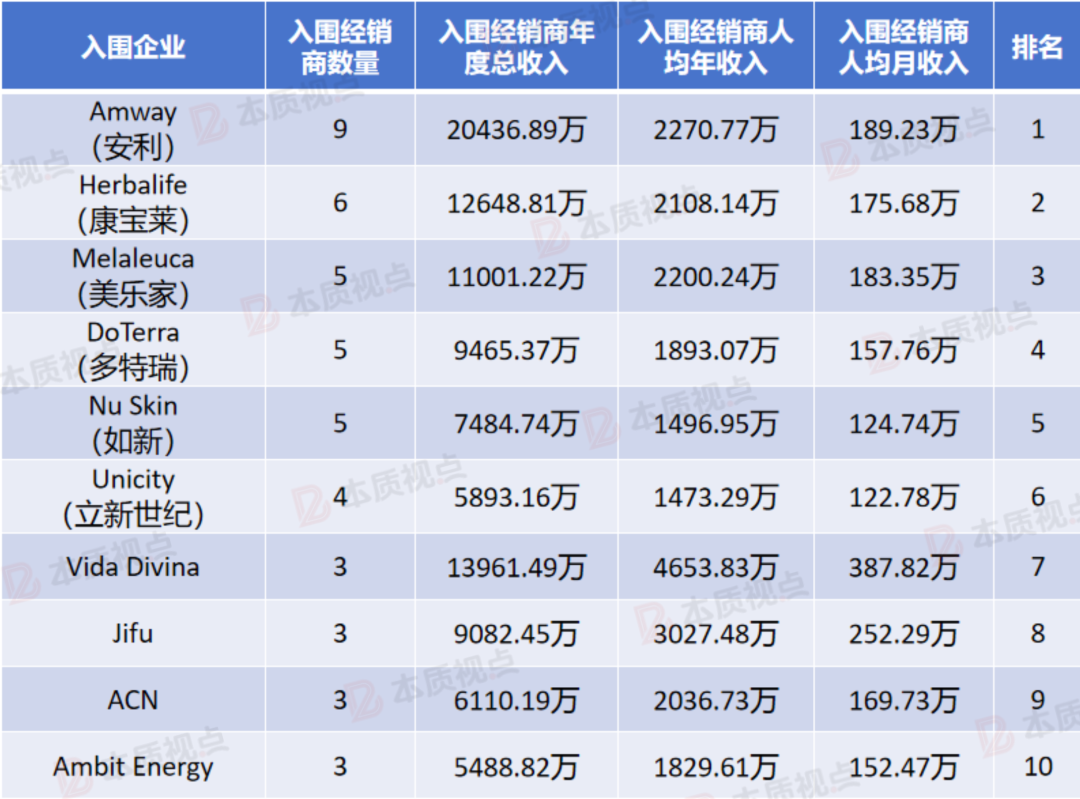 后面4家企业各有3位直销商入围,在这些大家并不太熟悉的企业中,经销商个人总收入排名第一的Vida Divina以4653.83万元的入围人员平均年收入再次力压群雄。