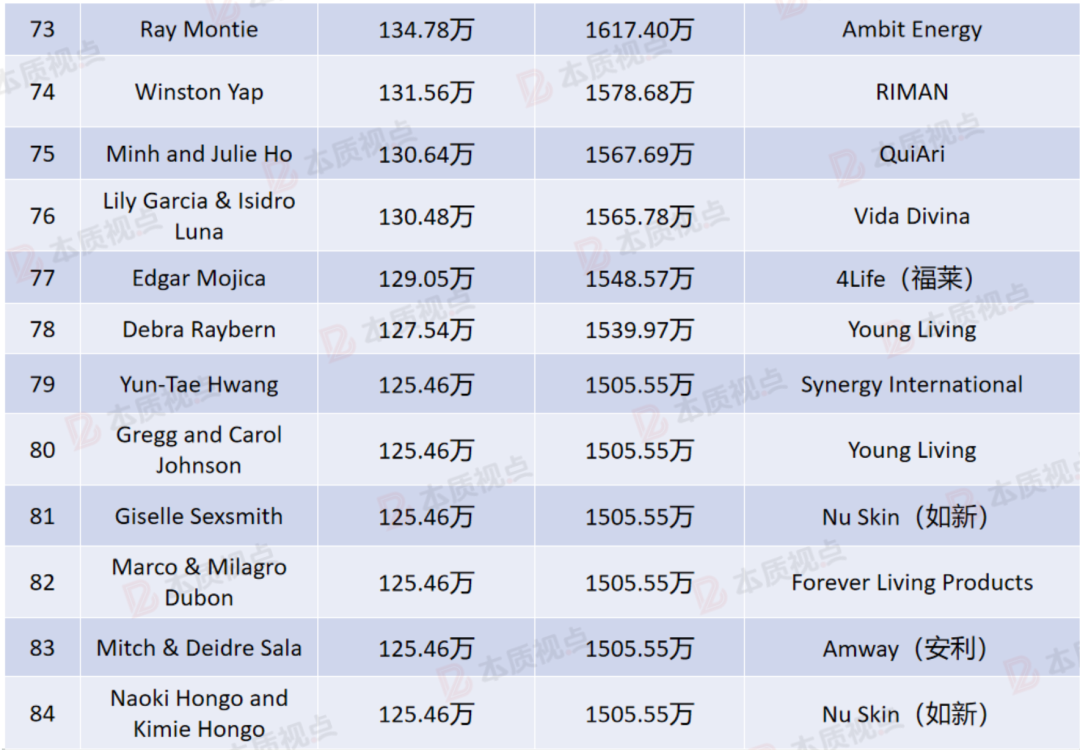 经本质视点统计,此次上榜的全球收入前100名直销商的年度总收入约为21.6亿元,人均年收入2160万元,人均月收入180万元,妥妥地实现了财富自由。
