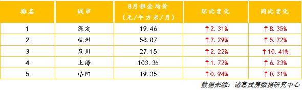 从环比上涨城市来看,8月租金环比上涨的TOP5城市为保定、杭州、泉州、上海、洛阳,环比分别上涨2.31%、2.29%、2.22%、1.72%、0.94%。