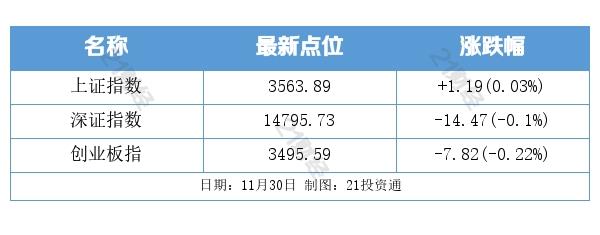 11月30日,A股三大股指涨跌不一,沪指涨0.03%,深证成指与创业板指微跌。11月收官,沪指本月累计涨0.47%,深证成指累计涨2.38% ,创业板指累计涨4.33%。