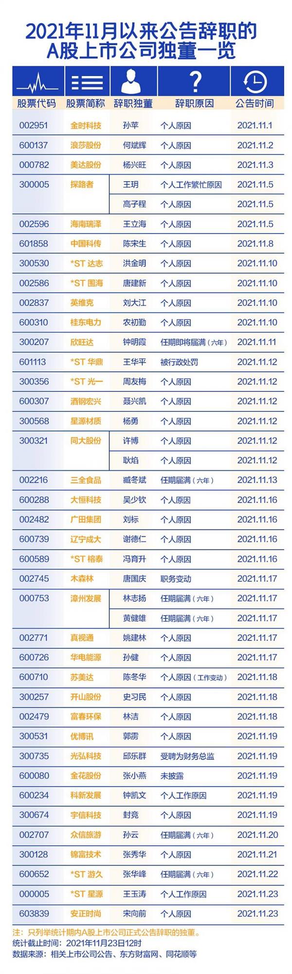 据南都大数据研究院统计,截至11月23日,11月以来已有38家上市公司的41名独董递交辞呈,并发布了相关公告。