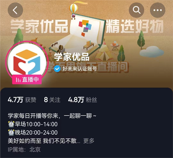 新东方爆火之后,学而思在今年8月底悄悄上线了自己的直播品牌“学家优品”。其首场直播发生在8月26日,维持了6个小时。