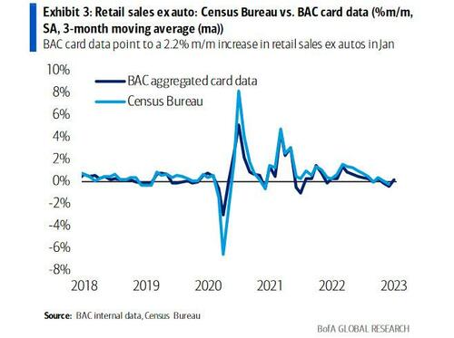 根据美银的统计报告,经过季节调整后,每个家庭的信用卡和借记卡消费总额环比增长了1.7%,这一因素促使美银预计,美国1月零售销售环比增速将超过普遍预期的2.2%,势创去年以来最高纪录。