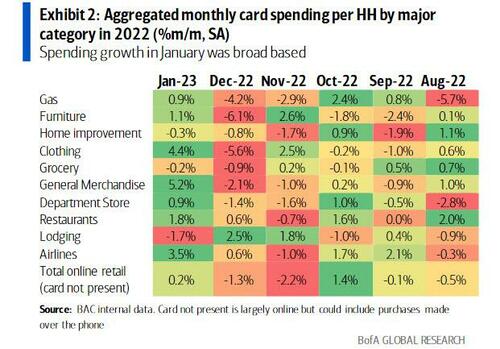 同比增幅之所以上升,部分是由于“基数效应”,2022年1月,奥密克戎的蔓延对服务业支出(尤其是旅游业)造成了冲击。因此,美银预计,美国家庭的信用卡和借记卡消费的同比增速将很快放缓。