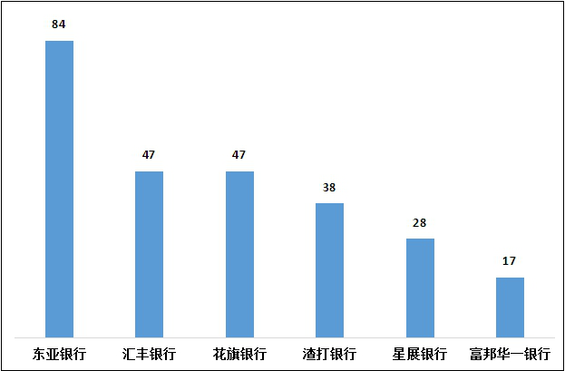 (三)外资银行的投诉数量。外国公司银行在2022年第四季度的投诉中位数为22.5件。其中,投诉最多的是:东亚银行(东亚银行)84件投诉,占总投诉的24.6%;其中47份来自汇丰,占13.8%;47宗,花旗银行,占13.8%的比例;38份来自渣打银行,占11.1%;28份来自星展银行,占8.2%;富邦华一银行有17宗,占百分之五。