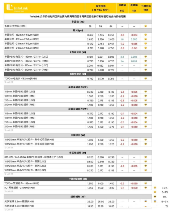 此外,本周持续有出清库存的状况,抛货价格持续下探至1.2-1.25元人民币的区间,然低价区段InfoLink将会扣除甩货低价。而高价部分,仍有前期订单在执行,然1.5元的价格已渐渐稀少。