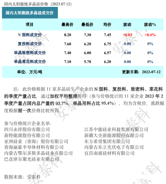证券之星光伏行业周报:中国有色金属工业协会硅业分会数据显示,本周多晶硅市场N/P价差扩大,整体持稳微涨。国金证券最新观点指出,硅料价格明确触底后,由下游快速增长的N型电池产能释放所驱动的上涨和分化,随下半年N型电池产能加速释放。宏观方面,国家发展改革委、国家能源局、国家乡村振兴局关于实施农村电网巩固提升工程的指导意见,文件指出,因地制宜通过合理配置分布式光伏和风电等建设改造可再生能源局域网。企业方面,晶澳科技发布公告称,公司本次向不特定对象发行可转换公司债券募集资金总额不超过896030.77万元,加码垂直一体化产能建设。亿晶光电发布业绩预增公告,预计2023年半年度实现营业收入约44亿元,较上年同期增加约27%;归母净利润2.80亿元到3.20亿元,同比增加1086%到1255%。