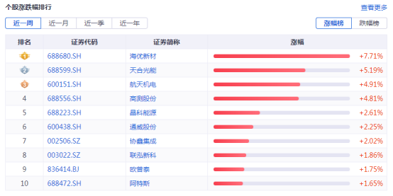证券之星光伏行业周报:中国有色金属工业协会硅业分会数据显示,本周国内硅料市场延续涨势,其中N型硅料涨幅超过P型硅料。中原证券最新观点指出,预计随着产业链上游价格逐步企稳,光伏下游价格将趋于稳定,从而带动下游装机需求。宏观方面,国家发改委等六部门文件指出,加强传统能源与新能源综合开发利用推动煤电、气电、风光电互补。企业方面,协鑫集成定增58亿加码电池片储能,爱旭股份定增60亿加码N型电池。