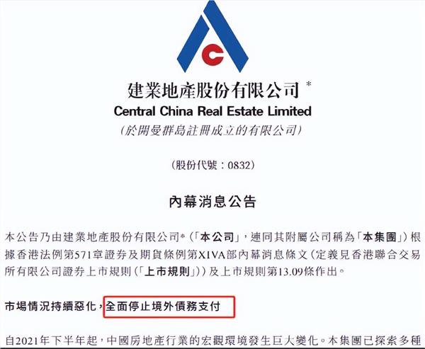 但公司最终还是没能逃脱出险的命运,建业地产今年6月23日夜间公告,未能在宽限期结束之前支付2024年到期之7.75%优先票据的利息,将暂停向所有境外债权人进行支付。