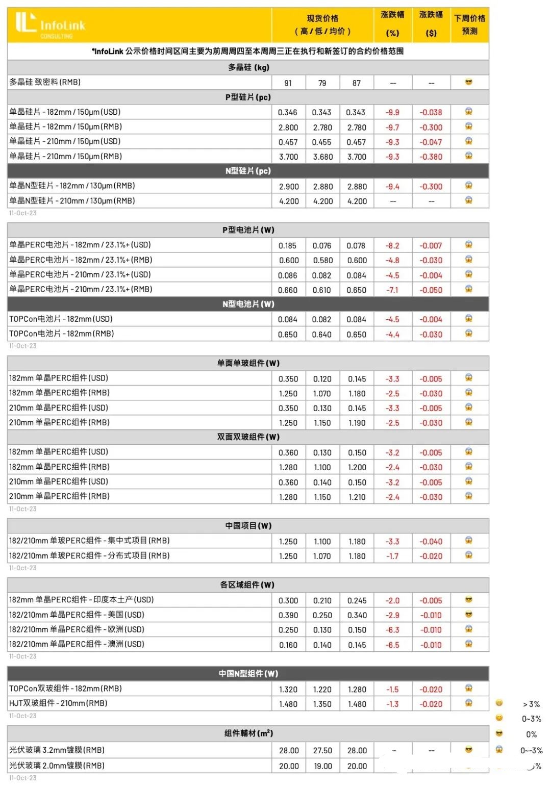 节后归来,近期受到供应链波动、海内外市场需求不如预期等因素影响,如节前所预示,组件价格持续受供应过剩、需求暂无爆发式增量等因素影响下降,影响终端业主部分观望心态再起,本周单玻均价约下滑至1.15-1.18元人民币。一线厂家新单仍在下滑1.14-1.15区间的价格在本周也开始增加。中后段厂家单玻平均价格考虑成本,部分僵持约在每瓦1.18-1.2元人民币,也有低价区间价格,本周甚至可以听闻四季度部分价格趋近1元大关。