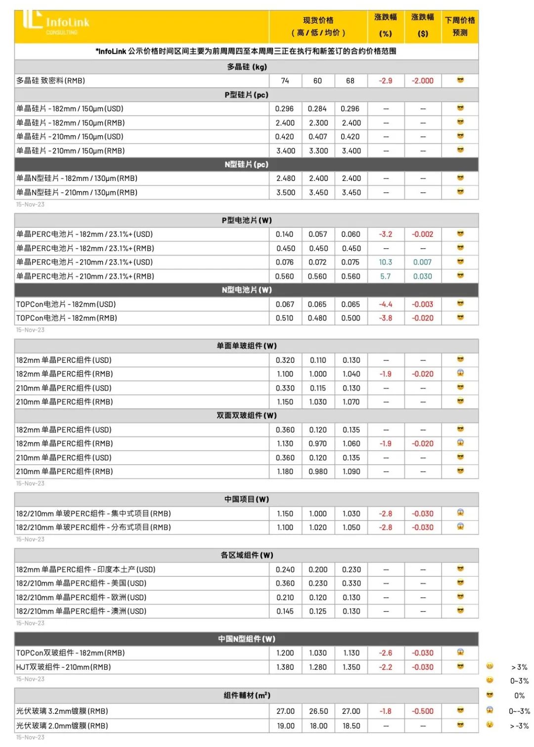 本周均价持续下探,一线厂家提供价格已来到每瓦1.03-1.05元人民币,预期12月主流价格将来到1-1.05的区间,组件已无太多下降空间。210组件受电池片价格影响,本周价格暂时稳定。低价部分确实有跌破1元人民币的交单,非库存抛货价格增多。