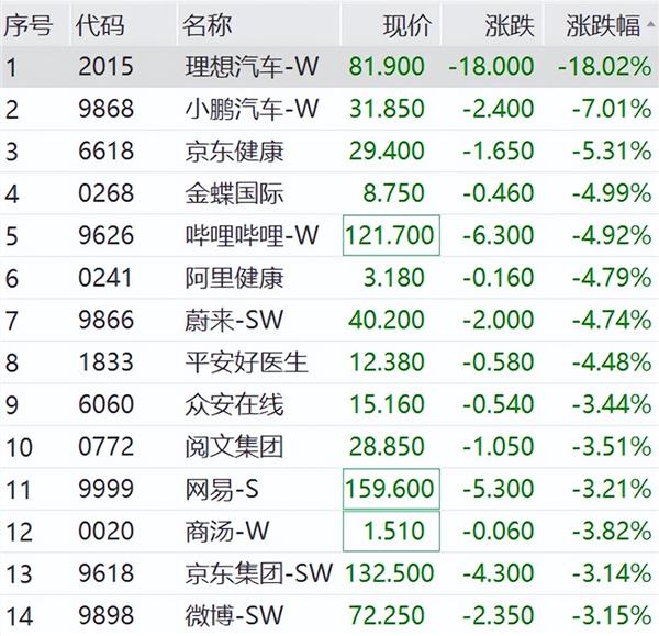 除理想汽车外,上午小鹏汽车、蔚来等“造车新势力”股价接连走低,领跌恒生科技指数。