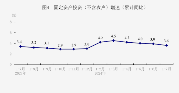 1-7月份,全国固定资产投资(不含农户)287611亿元,同比增长3.6%,比1-6月份回落0.3个百分点;扣除房地产开发投资,全国固定资产投资增长8.0%。分领域看,基础设施投资同比增长4.9%,制造业投资增长9.3%,房地产开发投资下降10.2%。全国新建商品房销售面积54149万平方米,同比下降18.6%;新建商品房销售额53330亿元,下降24.3%。分产业看,第一产业投资同比增长3.3%,第二产业投资增长12.5%,第三产业投资下降0.7%。民间投资同比持平;扣除房地产开发投资,民间投资增长6.5%。高技术产业投资同比增长10.4%,其中高技术制造业和高技术服务业投资分别增长9.7%、11.9%。高技术制造业中,航空、航天器及设备制造业,计算机及办公设备制造业投资分别增长37.7%、10.8%;高技术服务业中,专业技术服务业、电子商务服务业投资分别增长25.4%、17.9%。7月份,固定资产投资(不含农户)环比下降0.17%。