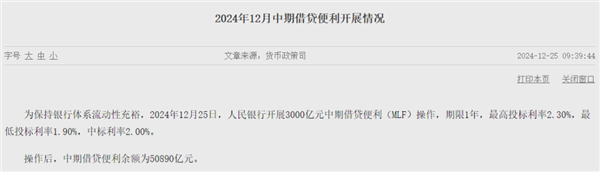 为维护银行体系流动性合理充裕,中国人民银行(下称“央行”)12月25日开展3000亿元中期借贷便利(MLF)操作,期限1年,最高投标利率2.30%,最低投标利率1.90%,中标利率2.00%。因12月16日有1.45万亿元MLF到期,当月MLF净回笼1.15万亿元。操作后,中期借贷便利余额为50890亿元。