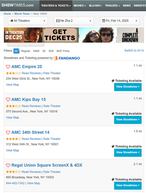 此外,目前,没有任何证据显示,该电影在美国上映被阻拦。在Showtimes、AMC THEATRES等美国票务公司网站上仍能找到与《哪吒2》相关的售票信息,且部分院线支持超前点映。