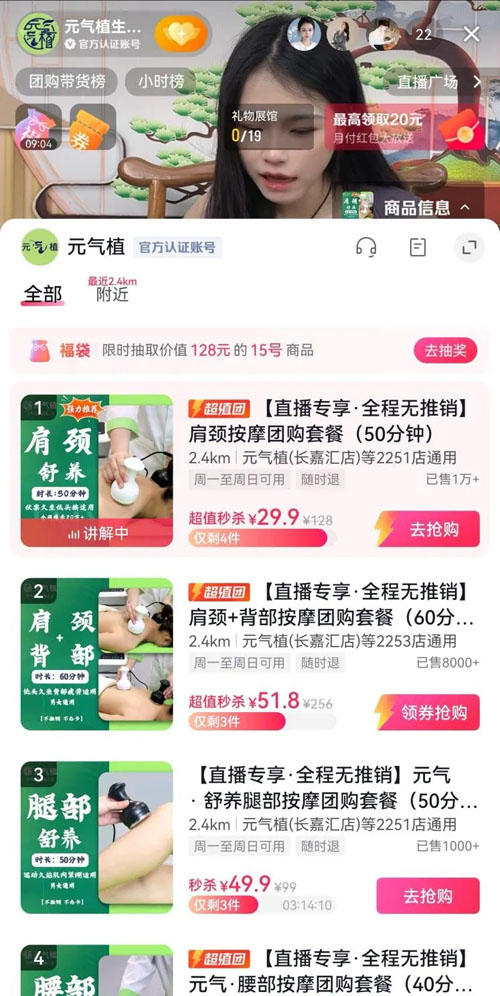 消费者在抖音直播购买的消费券,可以在全国所有店铺消费核销。消费券有60天的有效期,没用可以随时退。本质视点发现,抖音销售的元气植按摩项目价格亲民:50分钟肩颈按摩29.9元(原价128),60分钟肩颈背按摩51.8元(原价256);80分钟肩背腰按摩84元(原价564元),90分钟头肩颈背腰腿铂金全身焕能套餐159(原价671元)。所有在售的服务项目一共15项,平均单价在40元左右。按照抖音带货直播的规则,品牌方、抖音平台和主播都要参与销售分成,最终能落到店铺的收益能有多少呢?