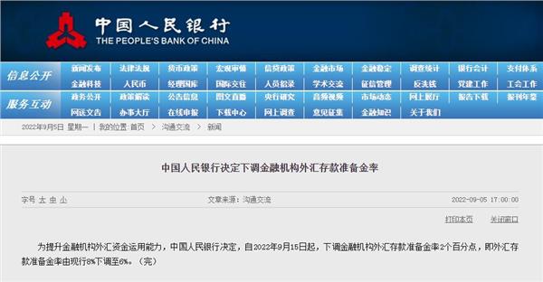 据央行网站消息,为提升金融机构外汇资金运用能力,中国人民银行决定,自2022年9月15日起,下调金融机构外汇存款准备金率2个百分点,即外汇存款准备金率由现行8%下调至6%。