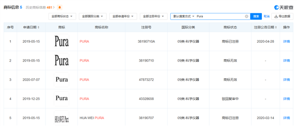 实际上,华为将P系列更名为Pura可能是“早有准备”。记者在天眼查网站中查询华为技术有限公司的知识产权信息发现,“PURA”和“HUA WEI PURA”商标已于2019年5月15日申请注册,分类为“科学仪器”,商标状态为“已注册”,注册公告时间分别为2020年4月28日和2020年2月14日。