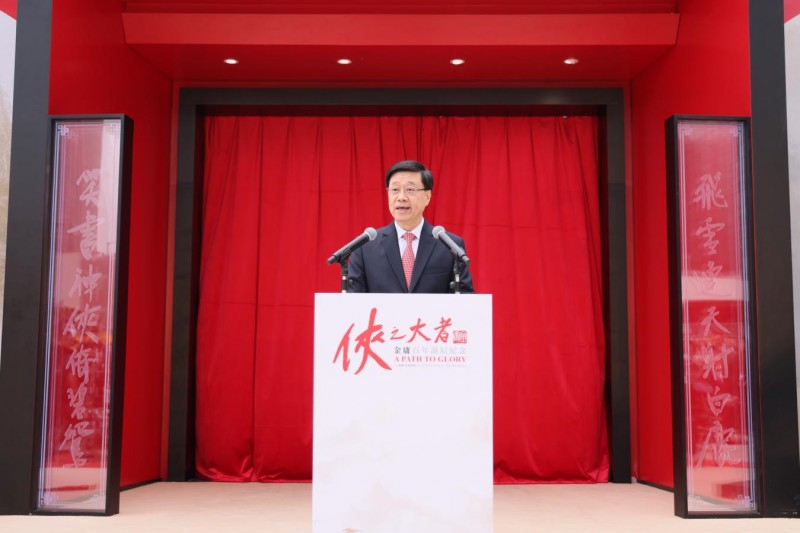 香港特别行政区行政长官李家超于致辞时表示:“香港是金庸武侠小说的诞生之地,而金庸的作品除了成为香港文化的一个金漆招牌,更成为了蜚声中外的文化现象。金庸小说全球发行量数以亿计,更被翻译成韩、日、英、法等多种外语,成为世界了解中国文化的重要窗口。查良镛博士创造的武侠世界,更蕴含深入人心的侠义精神。他的作品和精神影响了一代又一代华人,不论是忠厚朴实的郭靖、谦虚儒雅的陈家洛,还是豪爽磊落的乔峰、智勇双全的黄蓉,金庸作品中不同角色都有浓厚的家国情怀,大侠为国为民鞠躬尽瘁的故事,在全球传播,是说好中国故事的绝佳例子。”他表示:“我有信心,今次香港举办的金庸文化盛事,将会是全球的盛事,吸引世界各地的金庸迷来到香港,向这位武侠小说大师致敬,在香港以至全球华人社会再掀起一股“金庸热”!”